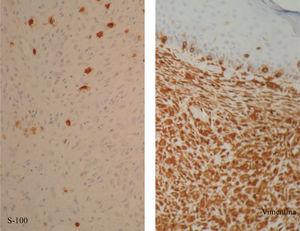 El estudio inmunohistoquímico reveló una lesión constituida por células que se marcaron intensamente con vimentina y resultaron negativas con S-100 (fig. 3), Melan-A, EMA, factor XIIIa, CD-31, CD-34 y CD-68.