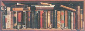 Óleo neorrealista pintado en el verano de 1993 sobre tabla preparada, de 45 x 120 cm, finalizado con un barniz holandés que le da la calidez necesaria, además de preservarle para una buena conservación. Situado en este momento en la sede de la Academia Española de Dermatología y Venereología, está compuesto por la imagen de muchos libros de mi propiedad y de otros amablemente facilitados por la Biblioteca de la Academia. Algunos representados, como el de Aicardius (31) y el de Astruc (37) me tomé la licencia de inventármelos ante la imposibilidad de encontrar los originales. El primero de ellos por la curiosidad que representa el que, parece ser, constituye el primer libro dedicado exclusivamente al estudio de las enfermedades de la piel; era en realidad una recopilación de las lecciones que recibió de su maestro Mercurialis. He querido que figuraran, sobre todo, autores de las escuelas europeas, tan influyentes en el conocimiento y evolución de la dermatología de la época, muchos de ellos maestros de nuestros maestros. Libros clásicos, fundamentales y alguna revista internacional y, naturalmente, la nuestra de Actas.