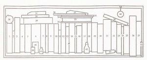 Por otra parte, se representan las medicaciones antisifilíticas de la época que marcaron hitos en esa terapéutica a través de un compuesto mercurial (39), un salvarsán (40) y una penicilina (41). La solución (42) y la pomada (43) no podían faltar porque simbolizan algunas de las formas medicamentosas tan empleadas aún hoy día. Por último, la lupa significa la exploración objetiva de las afecciones dermatológicas, tan importante para el diagnóstico clínico de ellas.