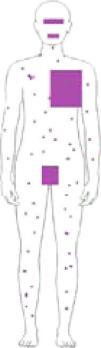 | Other | Depigmentation, hair loss | Moderate edema | Hemorrhagic zones after trauma | Spontaneous bleeding |