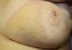 We present the case of an 83-year-old woman with a history of diabetes mellitus, dyslipidemia, chronic kidney failure, Parkinson disease, and left breast cancer treated with breast-conserving surgery with axillary lymph node dissection, radiotherapy, and chemotherapy in 2008. The patient was referred to our department for assessment of an asymptomatic yellowish plaque of 6 months’ duration on the left breast. The physical examination showed a large yellow-brown plaque that was slightly hard to the touch and had a verrucous, papilliform surface surrounded by an erythematous halo. The plaque had well-delimited borders and a peculiar geometric shape. There was no evidence of inflammation or local infection (Fig. 1). No other relevant findings were observed in the examination.