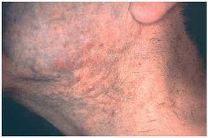 Fig. 1.--Lesión de la región mandibular izquierda consistente en una placa compuesta por numerosas lesiones papulonodulares de color eritematovioláceo.