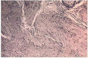 Fig. 2.--Detalle histopatológico de la dermis profunda, donde se aprecia una neoformación circunscrita compuesta por fibras musculares lisas entremezcladas con el colágeno circundante. (Hema-toxilina-eosina, ×80.)