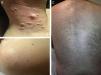 | Distribución | Agrupados (3-4 en abdomen)+dispersos | Agrupados (placa en ES y espalda)+dispersos | Agrupados (placa en ES) | Agrupados (placa en espalda)+dispersos | Lineal en ES zona deltoides | Agrupados (placa en espalda)+dispersos | Agrupados (placas múltiples)+dispersos |