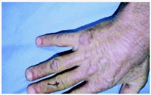 Fig. 1.--Múltiples pápulas eritematovioláceas en el dorso de las manos.