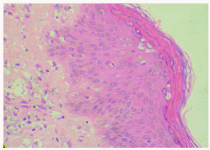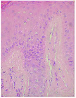 La mayoría de estos organismos serían eliminados según los tipos II y III de trasmigración de Mehregan1,2, es decir, a través de microabscesos o bien vía histiocitaria, en el interior de una epidermis acantósica, con formación de pequeños canales y denso infiltrado inflamatorio de la dermis. En los casos de leishmaniasis, la transmigración se produciría según el tipo I descrito por Mehregan1,2 en una epidermis sin mayor disrupción anatómica y con mínimo infiltrado inflamatorio. Se ha descrito eliminación de los cuerpos de leishmanias a través de los queratinocitos10-13, los folículos pilosos12 y las glándulas sudoríparas ecrinas2.