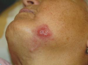 La exploración física mostró una placa infiltrada de unos 3× 3 cm de diámetro localizada sobre la rama mandibular izquierda. La superficie era eritematosa, lisa, brillante y presentaba una pequeña ulceración cubierta por una costra. Además, en la periferia de la lesión se palpaban cordones indurados y pequeños nódulos subcutáneos siguiendo el trayecto de los linfáticos proximales (fig. 1).
