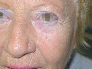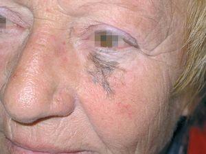 Una mujer de 68 años presentaba una mácula pigmentada de coloración marrón oscura con diferentes tonalidades y bordes irregulares debajo del párpado inferior izquierdo, que medía aproximadamente 4 cm de diámetro en su eje mayor (fig. 1). Con la sospecha de lentigo maligno se realizó biopsia en sacabocados de 3 mm de la zona más pigmentada de la lesión y se confirmó el diagnóstico al observarse melanocitos atípicos en la unión dermoepidérmica con extensión perianexial. Teniendo en cuenta la edad de la paciente, la localización y el diámetro de la lesión, se decidió instaurar tratamiento con crema de imiquimod al 5 % días alternos tres veces para semana (lunes, miércoles y viernes) una vez al día durante 7 semanas.