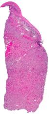 HistopatologíaEl estudio histológico revela una mucosa gingival revestida por un epitelio escamoso estratificado sin alteraciones relevantes. El corion se encuentra ocupado en su totalidad por un infiltrado inflamatorio caracterizado por un estroma conectivo que contiene numerosas células gigantes multinucleadas de tipo osteoclástico, células mesenquimales inmaduras y leve infiltrado predominantemente mononuclear. También se observan abundantes capilares con focos de extravasación hemática y depósitos de hemosiderina (figs. 2 y 3).