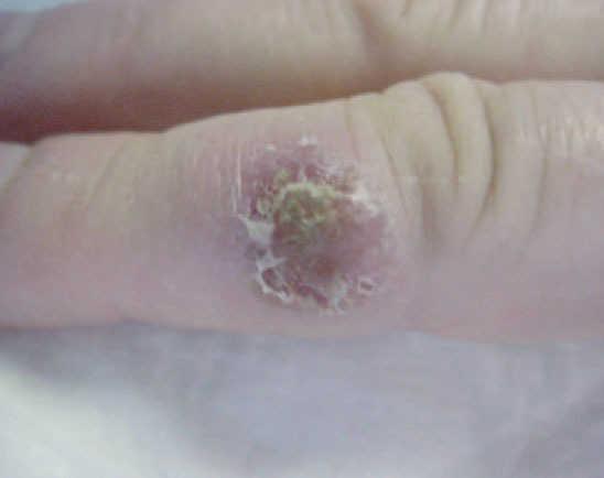 Una mujer de 56 años de edad, ama de casa y residente en el medio rural consultó en agosto de 2003 por una lesión cutánea recidivante en el cuarto dedo de la mano izquierda.