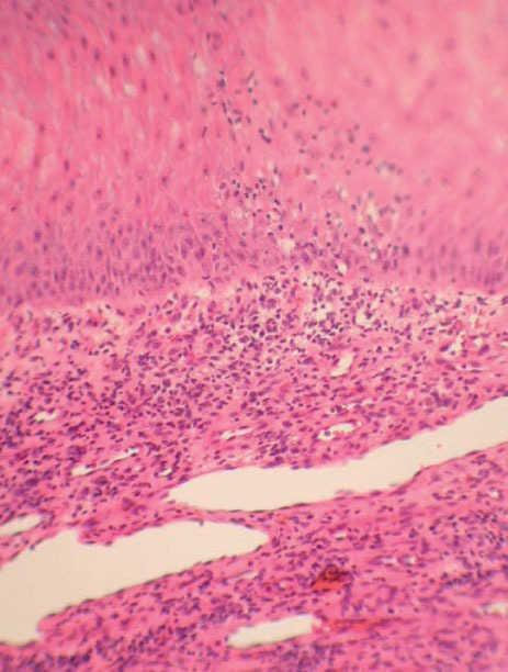 Los cambios histopatológicos se corresponden con las manifestaciones clínicas observadas; en todas las fases de la enfermedad pueden verse cambios citopáticos epidérmicos. En general, se caracteriza por una epidermis con marcada hiperplasia pseudoepiteliomatosa, balonización e inclusiones eosinófilas intracitoplasmáticas. En dermis existe una gran dilatación y proliferación vascular junto con un infiltrado inflamatorio agudo o crónico, según el estadio evolutivo3,7.