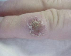 Fig. 1.—Nódulo eritematoso cubierto de costras escamosas en el dorso del dedo.
