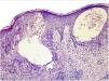 Ante la sospecha diagnóstica, se decidió la realización de biopsia. Se obtuvieron 2 fragmentos de piel para estudio con hematoxilina y eosina e inmunofluorescencia directa (IFD). En la biopsia se observó una epidermis ortoqueratósica con acantosis irregular, marcada exocitosis de eosinófilos y presencia de espongiosis con formación de vesículas espongióticas, La dermis superficial y media mostraba una dermatitis perivascular compuesta de un infiltrado mixto, de predominio linfocitario con abundantes eosinófilos (fig. 2).