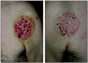 En la exploración física dermatológica se apreciaban varias áreas circulares bien delimitadas con eritema, equimosis y ampollas de contenido hemático que se distribuían siguiendo un patrón simétrico en escápulas, tórax y región lumbar (fig. 1).