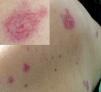 Mujer de 90 años con antecedentes personales de hipoacusia severa y osteoporosis, sin tratamiento habitual que consulta por lesiones asintomáticas localizadas en el tórax, los hombros y la parte alta de la espalda. Habían aparecido hacía 5 años de forma brusca permaneciendo estables desde entonces. No había recibido ningún tratamiento.