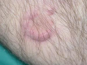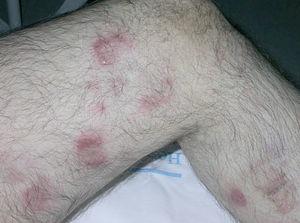 Un varón de 77 años que acude a nuestro servicio en junio de 2004 por un cuadro de un mes de evolución consistente en la aparición de una pápula eritematosa asintomática que había aumentado de tamaño rápidamente. Inicialmente se localizaba en la cara interna de la pierna izquierda, pero después habían ido apareciendo nuevas lesiones similares en el muslo y la cara posterior de la misma pierna. Como antecedentes patológicos destacaban hipertensión arterial, hipercolesterolemia, cardiopatía isquémica, accidente cerebrovascular previo sin secuelas, bronquitis crónica e insuficiencia renal crónica. La exploración física mostraba placas y tuberosidades localizadas en la cara interna del muslo izquierdo y en cara interna y posterior de la pierna del mismo lado (fig. 1). Algunas de las placas tenían una morfología arciforme y estaban infiltradas al tacto (fig. 2).