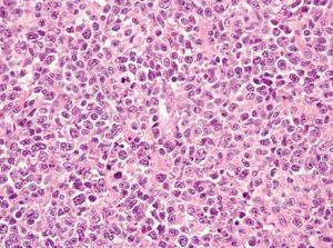 Dentro de los estudios complementarios realizados destacaba una β2-microglobulina de 6.217 (normal, 700-3.500). El estudio de extensión con TC cervicotoracicoabdominopélvica resultó normal, al igual que el aspirado y la biopsia de médula ósea. En sangre periférica y en médula ósea el reordenamiento resultó negativo y el inmunofenotipo normal. En el estudio de reacción en cadena de la polimerasa (PCR) para detección de reordenamiento clonal linfoide sobre material congelado no se detectó reordenamiento de inmunoglobulina H. La determinación de la translocación t(14;18), mediante técnica de hibridación in situ con fluorescencia (FISH) sobre material parafinado, resultó negativa.