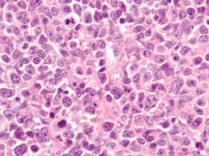 Dentro del infiltrado, densamente celular, predominaban los linfocitos de tamaño grande con núcleos redondeados, nucléolo excéntrico y cromatina finamente dispersa, que recordaban a los centroblastos; entre ellas se observaban frecuentes figuras de mitosis (fig. 3), así como una población de células de menor tamaño con núcleos más hipercromáticos y contornos más irregulares que corresponderían también a linfocitos aunque su número era menor (fig. 4). Se realizó tinción para CD20 que resultó intensamente positiva en la membrana de las células tumorales. El infiltrado resultó positivo para CD10 y bcl-2, y negativo para CD30 y bcl-6 (figs. 5 y 6).