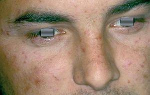 Fig. 1.—Pequeñas pápulas eritematosas parduzcas en zona mejilla, área periocular y párpado inferior.