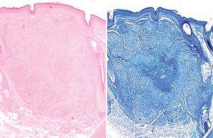 Fig. 2.—A) Imagen panorámica a pequeño aumento mostrando una lesión multinodular dérmica en aparente relación con un folículo piloso; B) Tinción de Ziehl-Nielsen en la se aprecia claramente una zona de necrosis central. (Hematoxilina-eosina, ×40; tinción de Ziehl-Nielsen, ×40.)