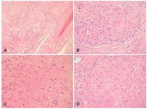 Fig. 3.—A) Imagen de detalle a mediano aumento en la que se aprecia que la lesión está formada por granulomas; B) Granuloma sarcoide; C) Granuloma tuberculoide; D) Granuloma en relación directa con un folículo piloso. (Hematoxilina-eosina, A, ×100; C B, C y D, × 250.)