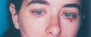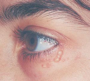 Fig. 2.--Detalle de pápulas amarillentas en párpado inferior izquierdo.