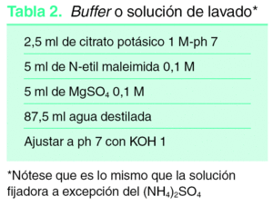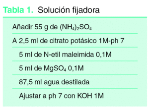 La técnica se basa en fijar la biopsia en la solución fijadora (tabla 1) en la que puede mantenerse hasta 10 días, y probablemente más, hasta su procesado. Tiempo suficiente para remitirlo a cualquier laboratorio. Antes de su congelación la muestra debe lavarse tres veces durante 10 minutos en un buffer (tabla 2) tras lo cual puede congelarse y procesarse de la forma habitual para inmunofluorecencia. La tabla 3 recoge un resumen del procedimiento y la figura 1 muestra un ejemplo positivo de una biopsia procesada de esta forma.