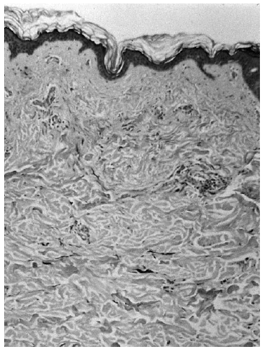 Presentaba una mácula hiperpigmentada de coloración azul-violácea y aspecto moteado que abarcaba la región interescapular. La lesión tenía unos bordes uniformes y bien delimitados (fig. 1). El resto de la exploración dermatológica no ofrecía ninguna otra lesión de interés. Se procedió a la realización de una biopsia cutánea que reveló una epidermis y una dermis normales salvo por la presencia en dermis reticular de células ovaladas, fusiformes y alargadas con intensa pigmentación melánica y algunas ramificaciones (figs. 2 y 3). Se efectuó una tinción con rojo Congo que resultó negativa. Las tinciones inmunohistoquímicas para proteína S100 y HMB 45 demostraron positividad de esas células. En la microscopia electrónica se pudo confirmar la presencia de melanocitos dérmicos. Debido a las dificultades para desparafinar la pieza no fue posible determinar la presencia de vaina extracelular melanocítica debido a la deficiente calidad de las imágenes.