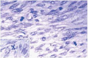 Fig. 2.--Detalle donde se observa que las células neoplásicas muestran núcleos fusiformes con diversos grados de atipia y frecuentes mitosis, algunas de ellas atípicas (inset) (HE).