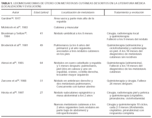 Aunque existen pocos datos en la literatura médica sobre las metástasis, las localizaciones más frecuentes son las pulmonares y abdominales (hígado)6,9. La incidencia de metástasis cutáneas por este tumor es excepcional, habiéndose descrito apenas algunos casos en la literatura (tabla 1). El primer caso fue descrito por Gardner en 1917, en una paciente que presentaba metástasis en piel de área sacra y parte más alta de la espalda10. Posteriormente, se han descrito apenas otros 6 casos más; en algunos sólo se producen metástasis cutáneas11,12, en otros, la afectación de la piel se acompaña de metástasis en otros órganos13, y más tarde Zarcone et al14 describen 2 pacientes con metástasis pulmonares asociadas a las cutáneas (tres nódulos en los pies y un nódulo en antebrazo derecho, respectivamente). Alessi et al15 presentaron una paciente con metástasis pulmonares, óseas y cutáneas (cuero cabelludo y espalda). El caso descrito por Hirota et al16 asoció nódulos subcutáneos abdominales junto a metástasis retroperitoneales; esta paciente recibió tratamiento quirúrgico y quimioterápico con buena respuesta (ifosfamida, piramicina y cisplatino), sin signos de recidiva a los 27 meses de la terapia.
