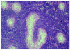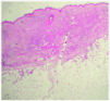 Un varón de 78 años, con antecedentes personales de hipertrofia benigna prostática, herniorrafia bilateral, desprendimiento vítreo e hipertensión arterial, acudió a la consulta de dermatología por presentar unas lesiones eritematovioláceas, edematosas, localizadas en ambos miembros inferiores, de 6 semanas de evolución (fig. 1). Algunas de estas lesiones tomaban el aspecto de una placa eritematosa escasamente infiltrada. No se palpaban adenopatías inguinales o axilares. En el estudio anatomopatológico de una biopsia cutánea destacaba la presencia de una infiltración de la dermis en prácticamente toda su extensión exceptuando una pequeña zona grenz (fig. 2). Este infiltrado se extendía hacia el tejido celular subcutáneo. Con mayor detalle, estaba constituido por unas células grandes de núcleo vesiculoso y nucléolo prominente (fig. 3), y se visualizaban fácilmente figuras mitóticas. En el estudio inmunohistoquímico las células eran positivas para CD20 y Ki67, y negativas para CD3 y CD30. Ante estos hallazgos el paciente fue diagnosticado de un linfoma B de células grandes difuso y se procedió a realizar un estudio de extensión con objeto de determinar si se trataba de un linfoma primario cutáneo o secundario. En la analítica sólo se detectó un aumento de b2-microglobulina de 2.496,7 mg/l (normal, 0-1.900) con lacticodeshidrogenasa (LDH) normal. En la tomografía computarizada (TC) sólo se detectaron hallazgos no significativos, sin observarse organomegalias ni adenopatías que pudieran tratarse del origen del linfoma.