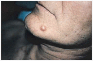 A los 4 meses del diagnóstico el paciente consultó al servicio de dermatología por la aparición de un total de 17 lesiones papulonodulares, eritematosas, algunas ulceradas, de consistencia firme, dolorosas a la palpación, localizadas en cuero cabelludo (fig. 1), mentón (fig. 2) y regiones mandibulares. Con el diagnóstico clínico de metástasis cutáneas por leiomiosarcoma, se realizó una biopsia de una de las lesiones del mentón.