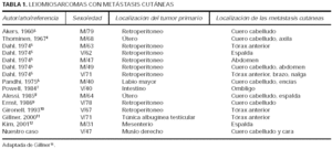 El primer caso de leiomiosarcoma con metástasis cutáneas fue publicado por Gardner en 19172. En la revisión de la literatura médica posterior sólo hemos encontrado un total de 14 pacientes con este cuadro (tabla 1). Aunque el número de pacientes recogidos es pequeño, pueden extraerse algunas conclusiones. Así, el paciente prototipo sería el de edad superior a 60 años, con un tumor primario localizado en retroperitoneo con lesiones cutáneas metastásicas en forma de pápulas y nódulos, en ocasiones ulcerados, generalmente asintomáticas, localizadas preferentemente en cuero cabelludo y tronco. El tiempo transcurrido entre el diagnóstico del tumor primario y el desarrollo de las lesiones cutáneas varía entre 3 y 16 meses, en incluso en los casos de Powell et al7 y Gironell et al10, las metástasis cutáneas fueron el primer signo de la enfermedad neoplásica. La presencia de lesiones secundarias en la piel es un dato generalmente de mal pronóstico, a pesar de la quimioterapia, aunque no se reseña en todas las publicaciones el tiempo de supervivencia del paciente.