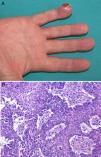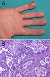 En la exploración se observa en el pulpejo de quinto dedo de la mano derecha una tumoración de 2cm de diámetro máximo, de coloración eritemato-rosada y con zonas queratósicas (fig. 2A). Se tomó biopsia punch 4mm, evidenciándose una epidermis parcialmente ulcerada y a nivel de la dermis se evidenciaba una proliferación de células neoplásicas de aspecto epitelial, con abundantes mitosis y atipia nuclear (fig. 2B). La tinción con citoqueratinas fue positiva. Ante la posibilidad de que se tratara de una metástasis acral, se realizó una TC toracoabdominopélvica en la que se objetivó una gran tumoración de 6cm de diámetro en el lóbulo superior derecho, con afectación bronquial e infiltración de mediastino, junto con múltiples nódulos milimétricos intraparenquimatosos en el pulmón izquierdo. Se diagnosticó de metástasis acral de carcinoma no microcítico de pulmón de células escamosas. Se realizó amputación de la falange del quinto dedo de mano derecha, dada la afectación ósea en el estudio radiológico. Por parte de Oncología, el paciente realizó tratamiento quimioterápico. En cuanto a la evolución del paciente, falleció algunos meses después por progresión de la enfermedad.