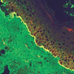 1. Depósitos de IgG. Se encuentran anticuerpos IgG anti-membrana basal en penfigoide ampolloso, penfigoide de mucosas, penfigoide gestacional, EAA y LEA, con prevalencia variable. En penfigoide gestacional sólo es positivo en el 10 %, en el penfigoide de mucosas en el 10-25 %. La sensibilidad sube al 60-80 % en penfigoides ampollosos y al 50 % en EAA. En el LEA sólo se detectan anticuerpos sobre piel separada (ver más adelante).