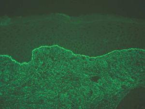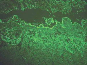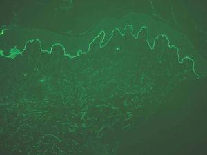 En las enfermedades ampollosas subepidérmicas siempre hay depósitos localizados en la unión dermoepidérmica y en la dermatitis herpetiforme, además existen depósitos en las papilas dérmicas. Tras comprobar la positividad de la fluorescencia en la unión dermoepidérmica hay que analizar 4 puntos 38-41: a) tipo de depósito autoinmune: IgG, IgA, IgM, complemento; b) existencia de uno o varios tipos de depósitos; c) patrón de fluorescencia: fundamentalmente lineal o granular, y c) posible existencia de fluorescencia fuera de la unión dermoepidérmica.