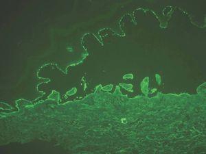 IgG y/o C3. Se ven en el penfigoide ampolloso, penfigoide de mucosas, penfigoide gestacional, liquen plano penfigoide, penfigoide anti-p200, epidermolisis ampollosa adquirida y lupus eritematoso ampolloso (fig. 8).