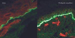 En EAA sobre extractos dérmicos se detecta una banda positiva de 290 kDa y más raramente de 145 kDa, que corresponden a colágeno VII y su fragmento NC1 N-terminal. Hay dos casos con reactividad doble frente al colágeno VII y la proteína de 200 kDa identificada en el penfigoide anti-p200 que pueden considerarse EAA con fenómeno de expansión de epítopos.