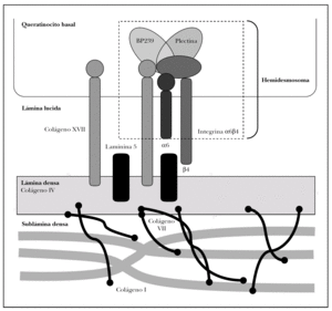 BP230. Es una proteína de 230 kDa también denominada BPAG1 (bullous pemphigoid antigen 1) 2,15. Se trata de una proteína intracelular del queratinocito basal situada en el complejo hemidesmosómico. Pertenece a la familia de las plaquinas. Su función es unir los filamentos intermedios del citoesqueleto al hemidesmosoma. Su extremo C-terminal se asocia a los filamentos intermedios de queratina. Su extremo N-terminal se une al colágeno XVII y subunidad b 4 de la integrina α6β 4, entre otras.