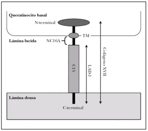 Es una glucoproteína transmembrana (fig. 3). Se ha clasificado dentro de la familia de los colágenos como colágeno XVII (COL17A1) porque en su extremo C-terminal existen 15 secuencias repetidas tipo colágeno (Gly-X-Y). Su extremo N-terminal es intracelular y se une a BP230, plectina y a la subunidad b4 de la integrina α6β4. El extremo C-terminal se extiende a través de la lámina lúcida y llega a la lámina densa 19.