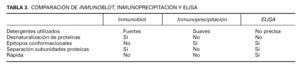 En la tabla 3 se resumen las ventajas y desventajas de las técnicas de inmunoblot, inmunoprecipitación y ELISA.