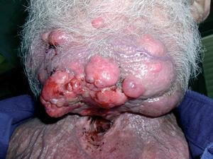 A la exploración, se objetivaba una gran masa tumoral en la cara anterior del cuello, con múltiples zonas ulceradas, nodulares, papilomatosas y criptas (fig. 1). De la profundidad de estas zonas necróticas se extrajo una larva móvil (fig. 2).