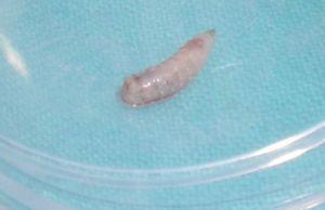 El tercer caso se trataba de una mujer de 87 años, con Parkinson y deterioro cognitivo grave, que presentaba un carcinoma basocelular ulcerado de 4 * 3 cm en región preauricular derecha, de 2 años de evolución, sobre el que sus cuidadores también observaron «gusanos», por lo que acudió a Urgencias en julio de 2004. Se extrajeron 11 larvas móviles.