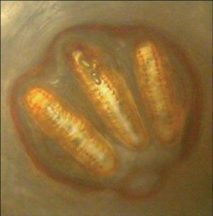 La identificación de las especies de larvas implicadas fue llevada a cabo por el Servicio de Microbiología del Hospital La Paz, mediante la comparación de cortes de las larvas extraídas fijadas en alcohol con imágenes de atlas de dípteros. Este examen identificó las larvas como pertenecientes al género Chrysomyia en el primer caso (fig. 4) y Sarcophaga en los dos últimos (fig. 5).