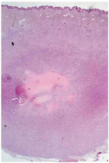 Fig. 2.--Lesión nodular en dermis y tejido celular subcutáneo con tres áreas histológicamente distintas: zona periférica de patrón leiomiomatoso, zona intermedia de patrón hemangiopericitoide y zona central hialinizada.