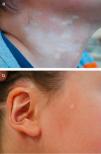 Paciente varón de 5 años con morfea mixta, circunscrita-lineal (MCDS) (clasificación de la PReS). Se muestra el componente de morfea circunscrita, con placas localizadas en a) lateral derecho del cuello y b) regiones preauricular y parotídea derechas, incluyendo afectación del pabellón auricular.