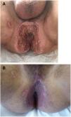 Perianal ulcers can develop in relation to a wide variety of causes (Table 1). When ulcers form during the use of pharmaceutical products, poor perfusion of the perianal region seems to be the main underlying mechanism, as has been reported after the use of vasoconstrictor-containing suppositories1 or nicorandil.2 Corticosteroids have also been associated with ulcers in this region3 and at other inter-triginous sites.4 To date the literature does not offer cases of perianal ulcers related to the use of a product for hemorrhoids. We report 11 cases of these ulcers forming after the use of the same hemorrhoid ointment, whose main active ingredients were triamcinolone acetonide, lidocaine, and pentosan polysulfate sodium (PPS). The cases illustrate both the potentially damaging effect of an over-the-counter product and the need to ask patients about the topical treatments they might be using when they consult us about perianal ulcers.