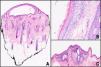Se realizó una biopsia en sacabocados de 4mm de una de las lesiones cuyo estudio histológico mostró una cavidad quística en la dermis superficial, sin contenido en su interior (fig. 2A), cuya pared estaba constituida por un epitelio escamoso estratificado formado por unas pocas capas celulares, sin granulosa, y revestido internamente por una cutícula eosinofílica de un contorno ondulado con unas espículas finas dirigidas hacia la luz (fig. 2B). Adyacente a la cavidad quística se encontraban varias glándulas sebáceas (fig. 2C).
