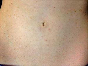 Exploración físicaSe observan pápulas parduzcas no descamativas de 3 a 5mm de diámetro localizadas predominantemente en el abdomen y afectando también las áreas torácica, axilar y pélvica. No presentan signo de Darier (fig. 1).