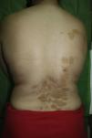 Mujer de 24 años sin antecedentes de interés que consultó por la aparición de una lesión sobreelevada en la espalda que le molestaba con el roce de la ropa. Esta lesión había aparecido sobre una de las múltiples placas que presentaba en la espalda desde el nacimiento, las cuales eran asintomáticas y habían ido aumentado de tamaño de forma paralela al crecimiento de la paciente.